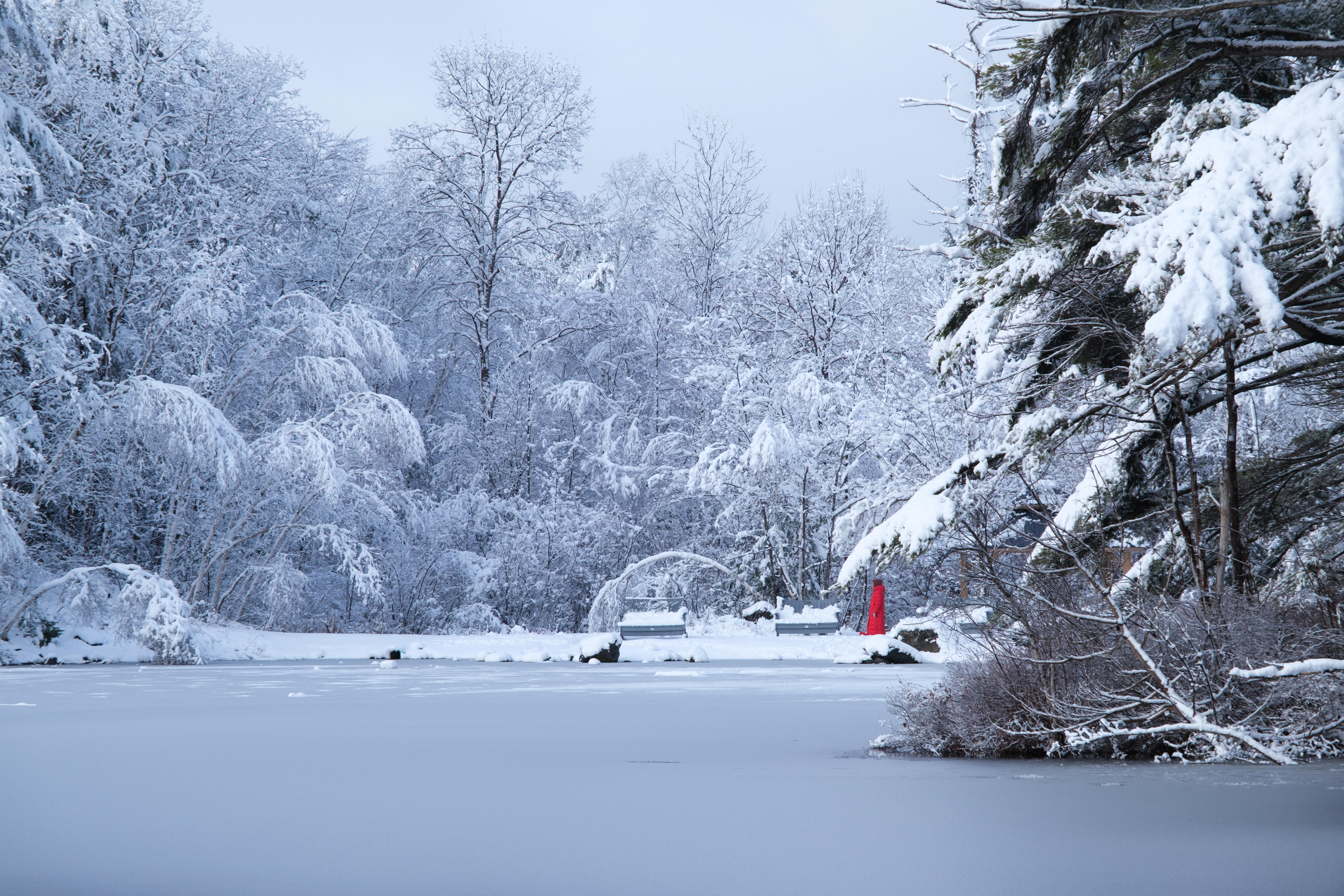 Conditions for these photos really came together. A perfect snowfall overnight, trees heavy with snow, a few precious moments of perfect light peeking through the clouds, and the woman in the red jacket. Perhaps my favourite image of all time.